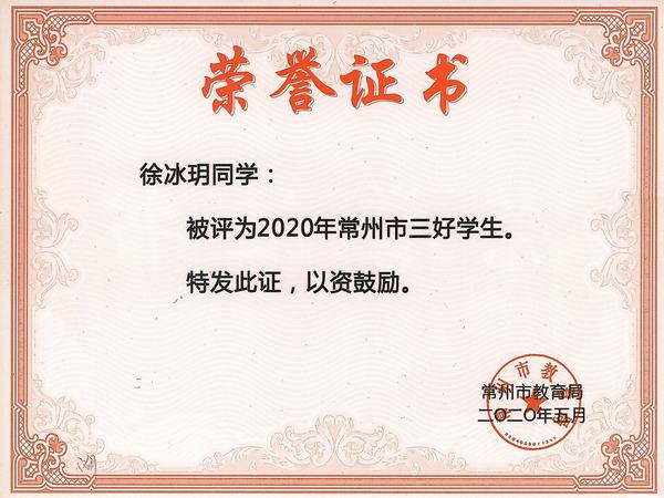 在2019年常州市“优秀学生干部”、“三好学生”评选活动中,我校学生王子灏获常州市“优秀学生干部”荣誉称号,陈佳奕、段笑晗、蒋辰安、沈鑫辰、徐冰玥、张猛、张羽佳等8位学生获常州市“三好学生”荣誉称号!