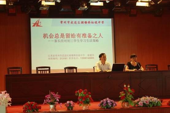 本次家长会由赵惠奇副校长主持,分两个议程:一、全体家长在学校阶梯教室听取教务处谢建华主任做的《家长应对初三学生学习生活策略》的专题讲座。二、家长们到孩子所在班级参加班级家长座谈会。