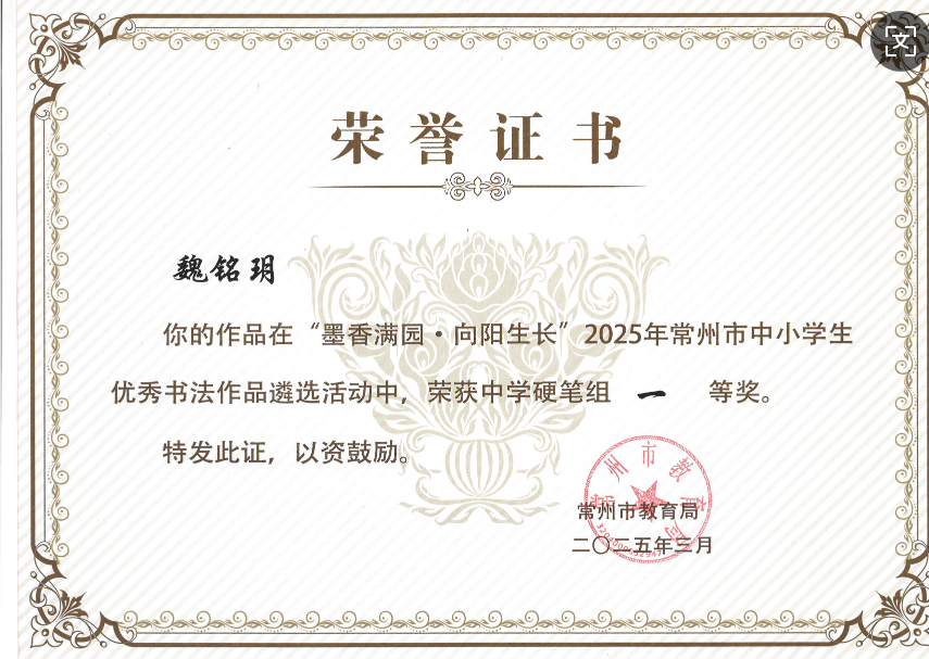 我校翟莹老师获2025年常州市中小学生“墨香满园·向阳生长”优秀书法作品遴选活动优秀指导教师奖!魏铭玥同学获2025年常州市中小学生“墨香满园·向阳生长”优秀书法作品中学硬笔组一等奖,荆雯祺同学获三等奖,陆毓希同学获中学硬笔组三等奖!