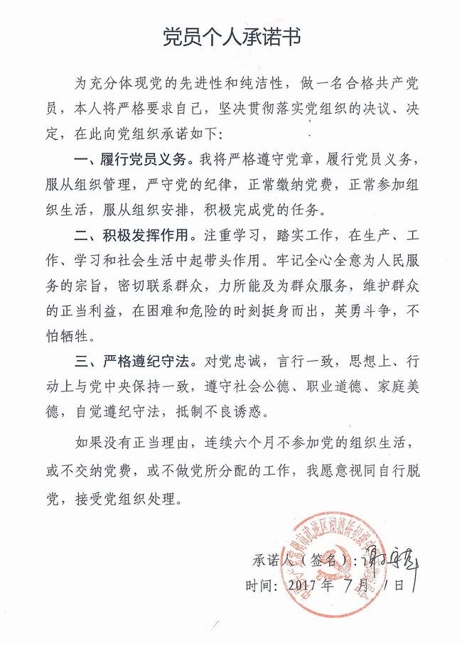 2017年7月党员承诺书(湖塘桥初级中学党支部、谢舟萍)